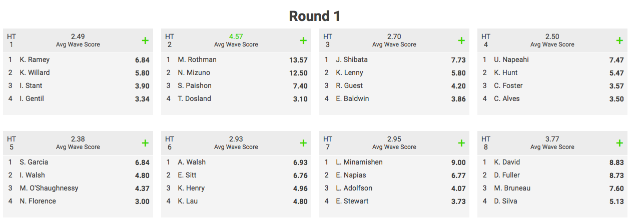 Ao todo foram realizadas dez baterias em um dia de condições apenas razoáveis do mar. O evento foi interrompido após a bateria 2 da segunda fase. Estrela principal da competição, John John Florence estreia apenas no round 4, assim como os brasileiros Ian Gouveia e Raoni Monteiro, que aguardam seus adversários.