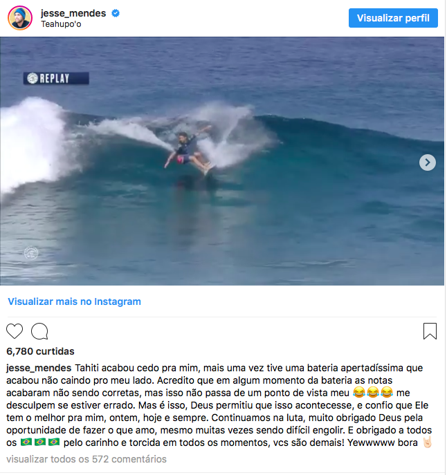 O brasileiro Jessé Mendes usou suas redes sociais para lamentar a eliminação na terceira fase da etapa de Teahupoo do Circuito Mundial de surfe, na noite desta quinta-feira (manhã de sexta na Polinésia Francesa). Derrotado por apenas 10 décimos pelo australiano Wade Carmichael, o paulista do Guarujá acredita que as pontuações dadas pelos juízes na bateria não foram justas.