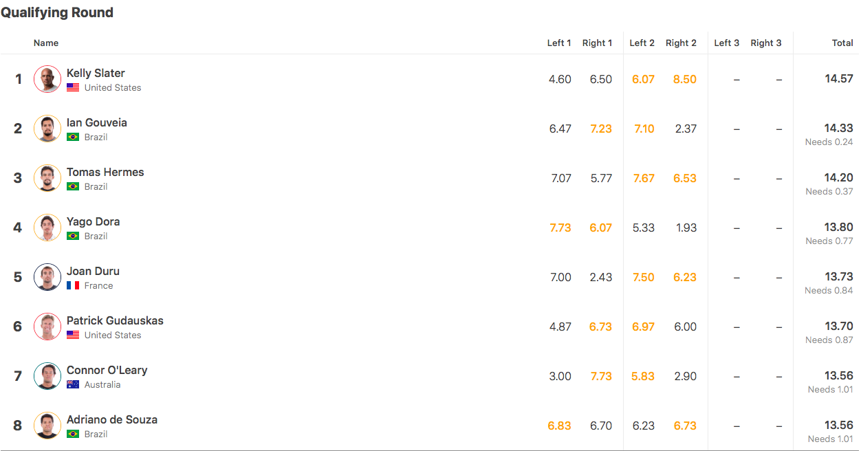 Destaque para Ian Gouveia que foi o dono da melhor atuação entre os brasileiros no primeiro dia do Surf Ranch Pro. Com muito controle nos tubos e variação de manobras, ele anotou 7.23 na direita e 7.10 na esquerda para assumir a segunda colocação no ranking. Já Tomas Hermes, Adriano de Souza e Yago Dora também garantiram vaga entre os oito melhores, mas podem perder algumas posições nesta sexta-feira, quando os 18 primeiros do ranking do CT estreiam no evento.