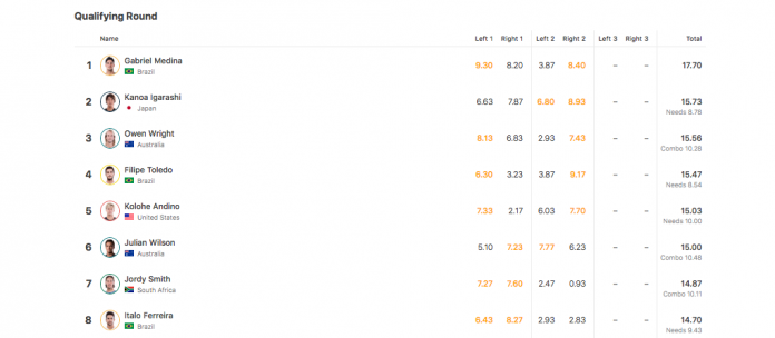 Atual líder do CT, Filipe Toledo caiu em suas três primeiras tentativas, mas recuperou-se na última onda, cravando 9.17 pontos na melhor direita do dia no Surf Ranch. Com 15.47 no somatório, Toledo figura em quarto no ranking. Quem também garantiu lugar entre os oito primeiros foi Italo Ferreira. O potiguar se deu melhor nas duas primeiras tentativas. A sua melhor onda foi para a direita com uma nota 8.27. Na melhor esquerda, ele mesclou aéreos e laybacks para anotar 6.43 e terminar o dia em oitavo do ranking geral.