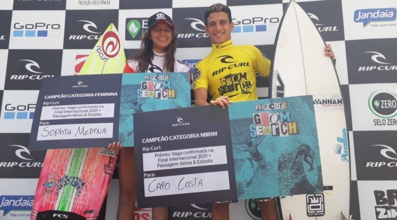 As conquistas e as viradas se repetiram na final do Rip Curl Grom Search 2020, realizada na Praia da Barra, no Rio de Janeiro neste domingo (16). Como em 2019, as duas categorias principais tiveram como campeões os paulistas Caio Costa e Sophia Medina. Os dois surfistas da Praia de Maresias, em São Sebastião, bateram recordes. Ele com o quarto título no Circuito, o segundo na mirim, e ela sendo a primeira tricampeã entre as meninas.